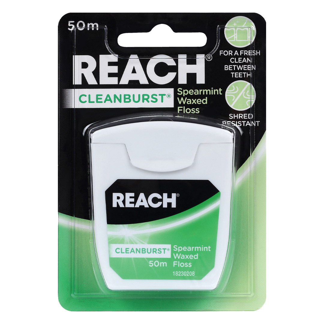 Reach Cleanburst Spearmint Waxed Floss is shred resistant and slides easily between teeth. Helps remove more plaque than brushing alone.